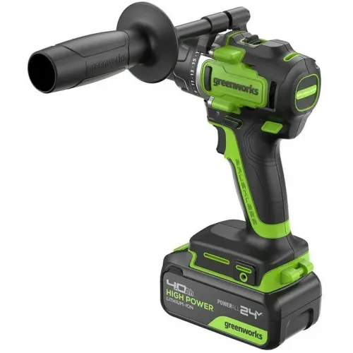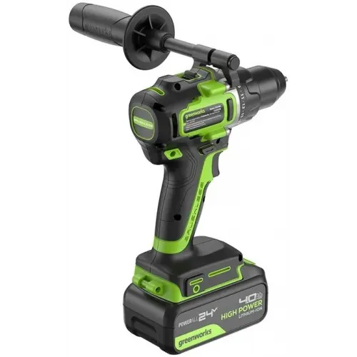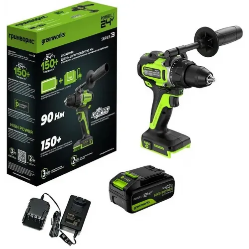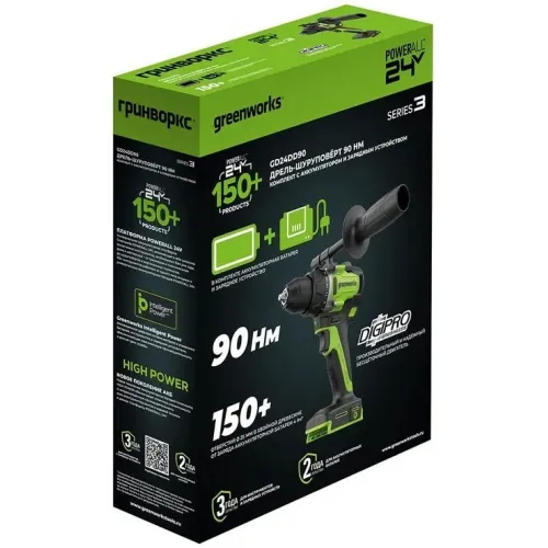 | Комплект поставки | Дрель-шуруповерт Greenworks GD24DD90; переставляемая боковая рукоятка; поясная клипса + винт; 2 хАКБ 4Ач; зарядное устройство; руководство по эксплуатации; гарантийный талон. |