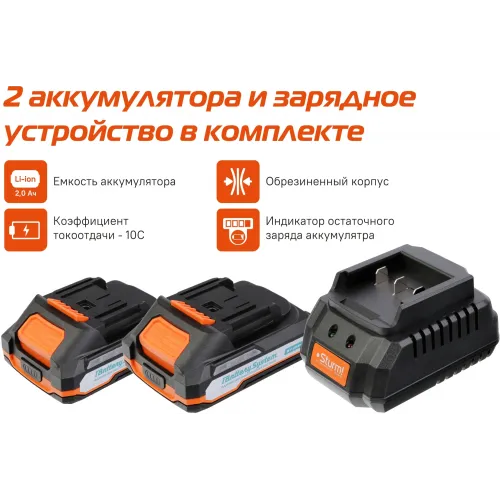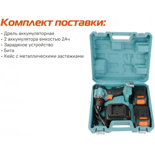 | Комплект поставки | Дрель-шуруповерт, аккумуляторная батарея (2 шт.), зарядное устройство, двусторонняя бита, инструкция по эксплуатации, инструкция по безопасности, кейс. |