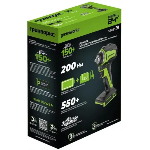 | Комплект поставки | Гайковерт ударный Greenworks G24IW200; 1 хАКБ 2Ач; 1 х Зарядное устройство; Руководство по эксплуатации; Гарантийный талон. |