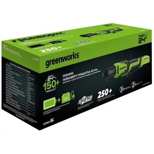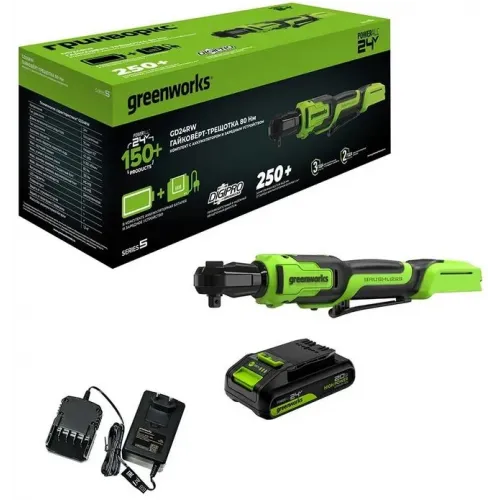 | Комплект поставки | Гайковерт-трещотка Greenworks GD24RW; 1 хАКБ 2Ач; 1 х Зарядное устройство; Руководство по эксплуатации; Гарантийный талон; Прочная сумка для переноски/перевозки. |