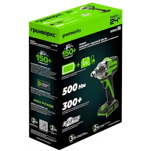 | Комплект поставки | Гайковерт ударный Greenworks IW5500; Поясная клипса + винт; 1 хАКБ 5Ач; 1 х Зарядное устройство; Руководство по эксплуатации; Гарантийный талон. |