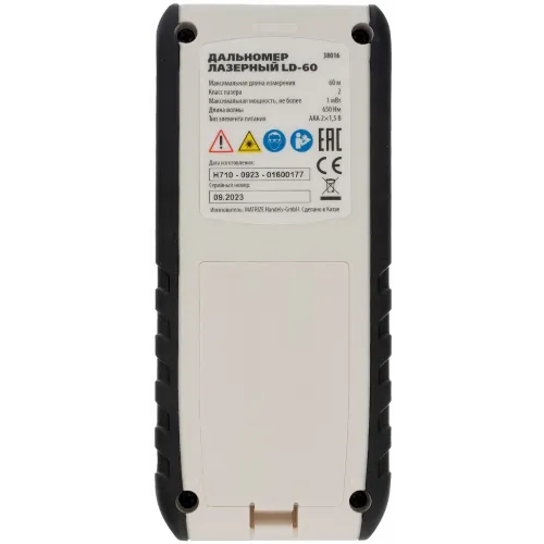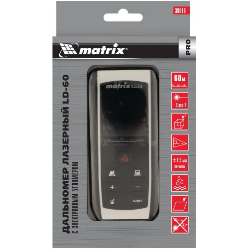 | Описание | Лазерный дальномер LD-60 торговой марки Matrix предназначен для измерения линейных расстояний и углов, вычисления площадей и объемов. Предусмотрен необходимый набор дополнительных опций: суммирование и вычитание показаний, вычисление площади и объема, вычисления по теореме Пифагора. |