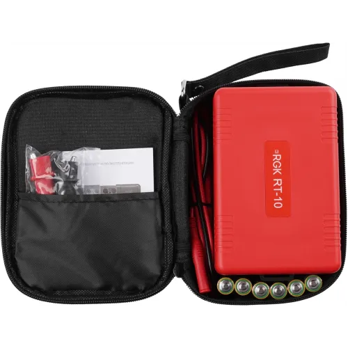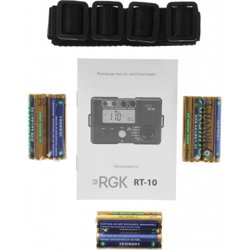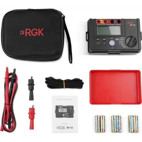 Комплект поставки | Мегаомметр RGK RT-10, кабель измерительный с пробниками - 2 шт., чехол, зажимы типа "крокодил" - 2 шт., ремень для переноски, батарея питания АА - 6 шт., руководство по эксплуатации. |