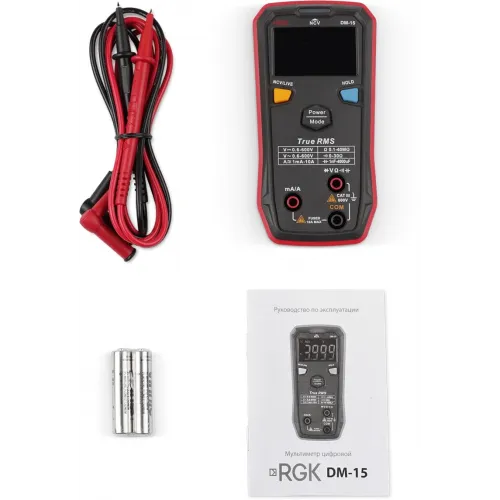 Комплект поставки | Мультиметр RGK DM-15, кабель измерительный с пробниками - 2 шт., батарея питания ААА - 2 шт., руководство по эксплуатации. |