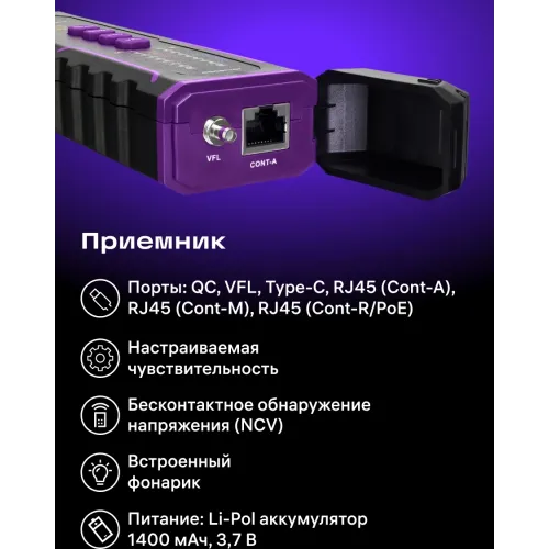 | Особенности | Функция Port Flash для определения сетевого порта с подключенным кабелем на роутере/коммутаторе; Время непрерывной работы передатчика при полном заряде – 15 ч., приемника – 10 ч.; Патч-корды типов RJ11 и RJ45 в комплекте; Измерение длины кабеля в диапазоне от 2,5 до 200 м. TDR-методом. |