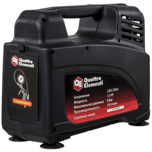 | Описание | Компрессор поршневой безмасляный 919-860 QUATTRO ELEMENTI KM 0-150 ( 150л/мин, 1.5л.с, 8 бар, 9.5кг). В комплекте пистолет для накачки шин и переходники. |