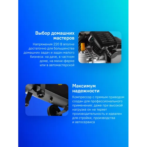 | Описание | Масляный компрессор с прямым приводом для мастерской, гаража или предприятия. Двигатель мощностью 2200Вт нагнетает до 330л воздуха в минуту. Совместим с дрелями, гайковёртами, краскопультами и т.д. Вместительный ресивер на 50л позволяет реже включать двигатель для подкачки воздуха. |