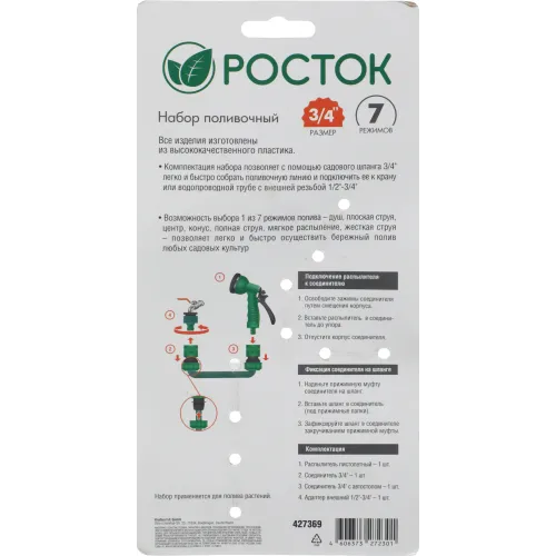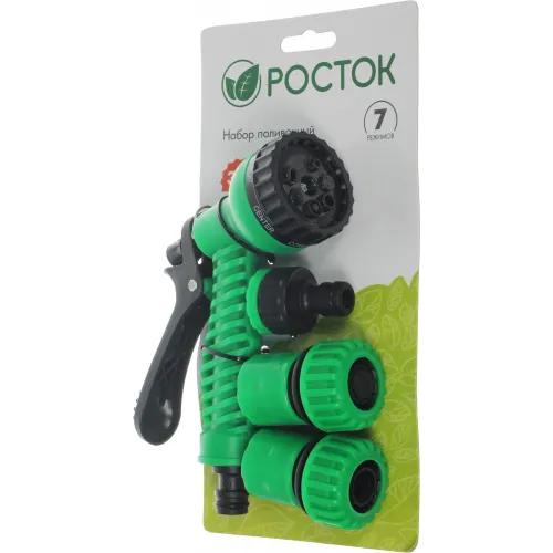 | Описание | РОСТОК НП-34 набор поливочный: пистолет с 7 режимами, комплект соединительной артматуры 3/4", пластиковый |