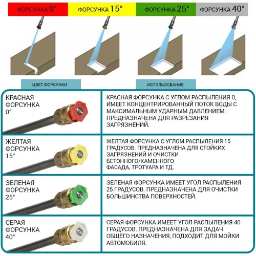 | Комплектация | Пистолет-распылитель (1 шт), Напорный шланг (1 шт), Пеногенератор (1 шт), Фильтр (1 шт), Сменные форсунки (4 шт), Игла для очистки сопла (1 шт) |