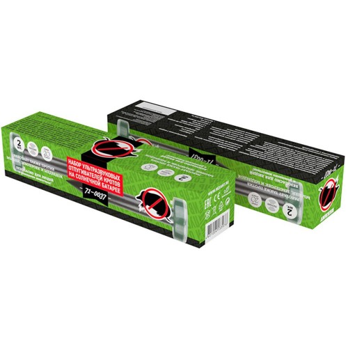 | Дополнительно | Отпугиватели работают от встроенных аккумуляторов 80 mAh, заряжаются автоматически от солнечный батарей с фотоэлементами 40х40 мм. |