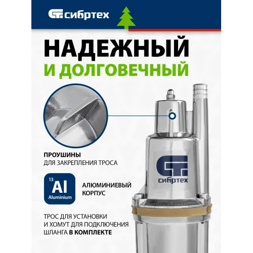 | Особенности | Используется для подачи воды из колодцев и скважин, а также для перекачивания чистой пресной воды. Преимущества: высокая производительность; алюминиевый корпус ;трос и хомут для шланга в комплекте. |