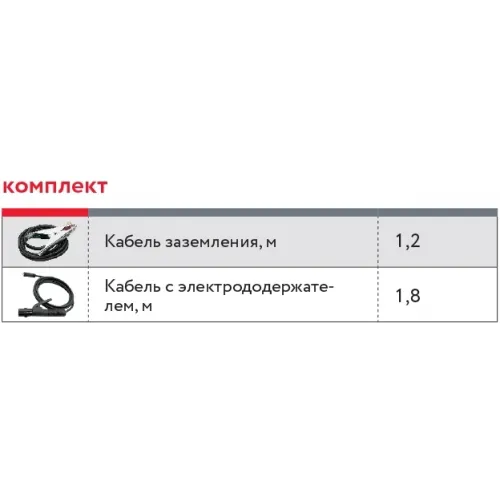 | Комплектация | Сварочный аппарат, кабель с электрододержателем 1,8 м., кабель заземления 1,2 м., инструкция. |