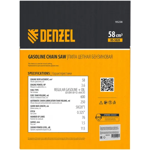 Бензопила Denzel DS-5820 2648Вт 3.6л.с. дл.шины:20" (50cm) (95238)