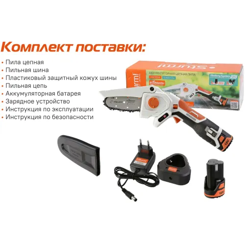 | Комплектация | Пила цепная, Пильная шина, Пластиковый защитный кожух шины, Пильная цепь, Аккумуляторная батарея, Зарядное устройство, Инструкция по эксплуатации, Инструкция по безопасности |