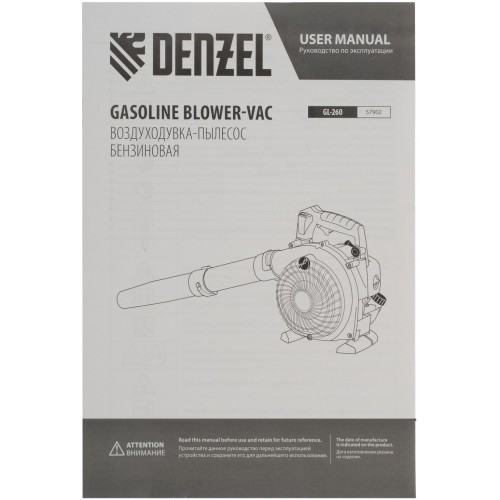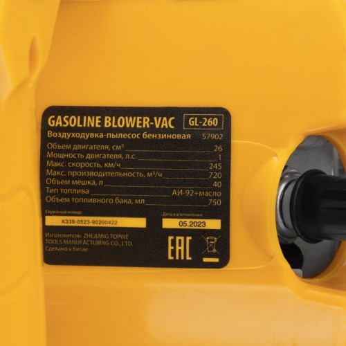 | Комплектация | Воздуходувка-пылесос бензиновая, труба напорная (из двух частей: тип А и тип В), труба всасывающая (из двух частей: тип С и тип D), труба разгрузочная, набор инструментов, дозатор для приготовления смеси, мешок для мусора с ремнем, руководство пользователя. |