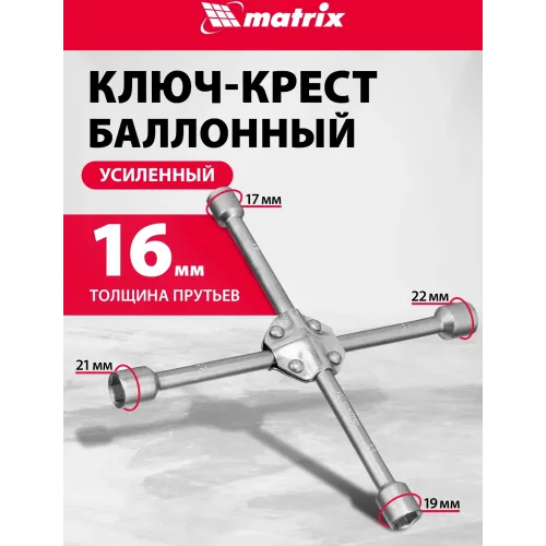 | Описание | Ключ-крест баллонный, 17 х 19 х 21 х 22 мм, усиленный, толщина 16 мм |
