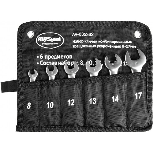 Описание | Набор ключей комбинированных трещоточных укороченных 8-17 мм. "AV Steel" 6 предм. в сумке |