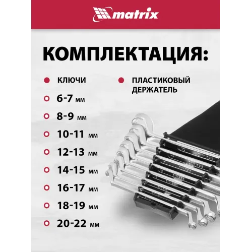 | Описание | Набор накидных ключей Matrix 15332 из стали CR-V с покрытием из полированного хрома, 8 шт., предназначен для монтажа и демонтажа крепежных элементов размером 6-22 мм. Инструмент предназначен для эксплуатации в бытовых условиях, автосервисах и частных мастерских. |