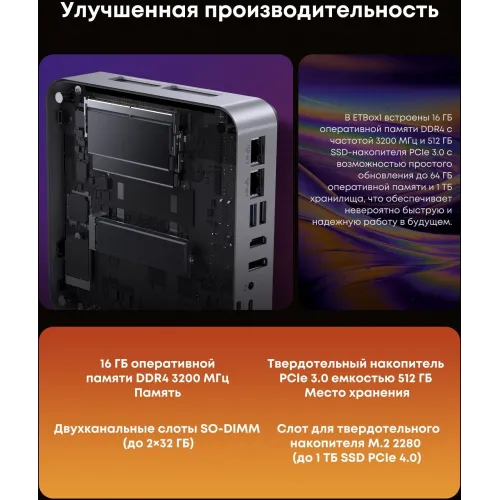 | Описание возможностей апгрейда | 1х M.2 до 1 Тб |