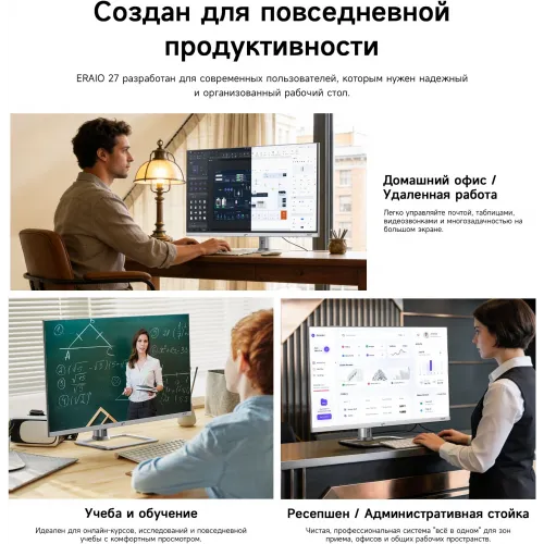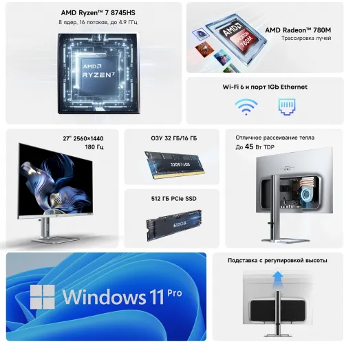 Моноблок Acer Gadget E10 ERAIO 27" 2K Ryzen 7 8745HS (3.8) 16Gb SSD512Gb 780M Windows 11 Pro GbitEth WiFi BT 120W клавиатура мышь Cam серебристый/черный 2560x1440