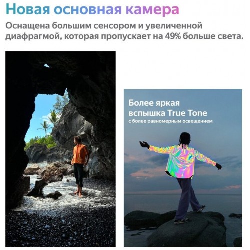 | Режимы съемки фронтальной камеры | режим "Портрет" с улучшенным эффектом боке и функцией "Глубина", портретное освещение, анимированные смайлики Animoji и Memoji, ночной режим, фотографические стили, широкий цветовой диапазон для фотографий и Live Photos, коррекция искажений объектива |