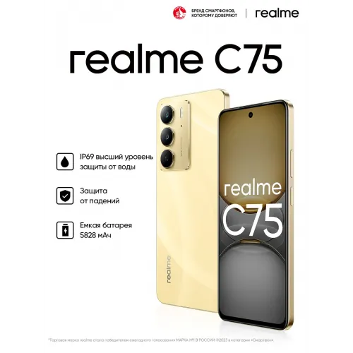 Смартфон Realme RMX3941 C75 128Gb 8Gb золотой моноблок 3G 4G 2Sim 6.72" 1080x2400 Android 14 50Mpix 802.11 a/b/g/n/ac NFC GPS GSM900/1800 GSM1900 Protect A-GPS microSD max2048Gb