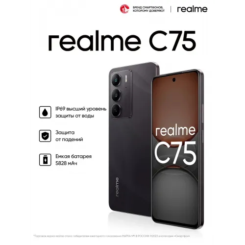 Смартфон Realme RMX3941 C75 256Gb 8Gb черный моноблок 3G 4G 2Sim 6.72" 1080x2400 Android 14 50Mpix 802.11 a/b/g/n/ac NFC GPS GSM900/1800 GSM1900 Protect A-GPS microSD max2048Gb