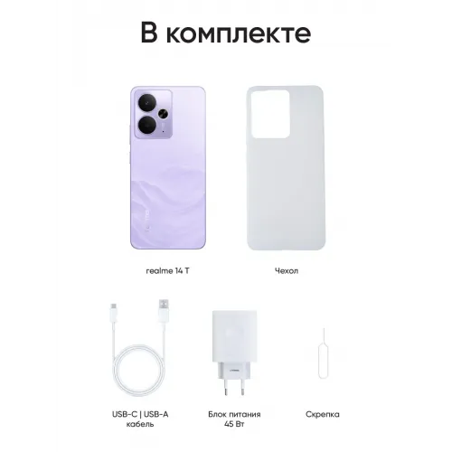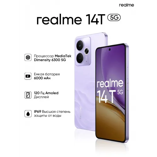 Смартфон Realme RMX5078 14T 5G 128Gb 8Gb фиолетовый моноблок 3G 4G 2Sim 6.67" 1080x2400 Android 15 50Mpix 802.11 a/b/g/n/ac NFC GPS GSM900/1800 GSM1900 Protect