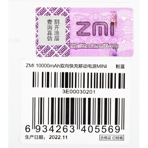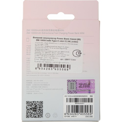 Мобильный аккумулятор ZMI QB817 10000mAh QC3.0/PD3.0 22.5W 3A 2xUSB-A/USB-C голубой/розовый (QB817 COLOR)