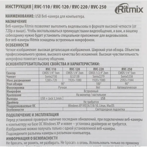 Камера Web Ritmix RVC-250 черный 5Mpix (2592x1944) USB2.0 с микрофоном