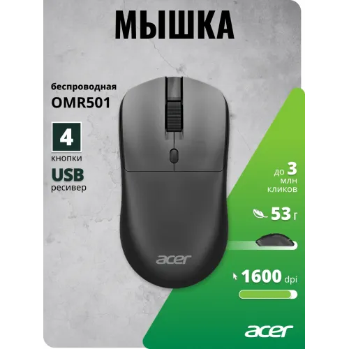 Мышь Acer OMR501 черный оптическая 1600dpi silent беспров. USB 4but (ZL.MCE11.016)