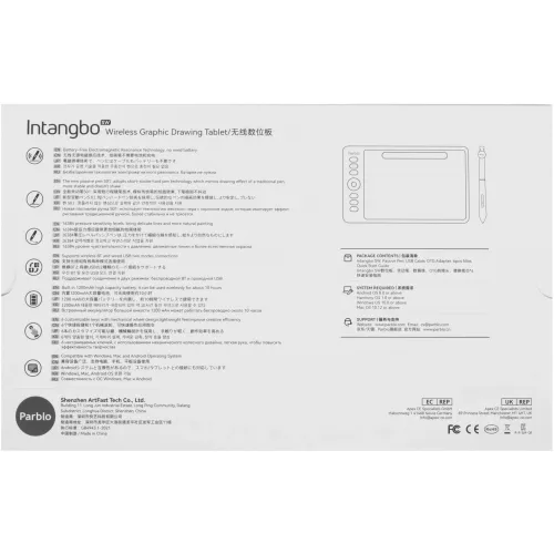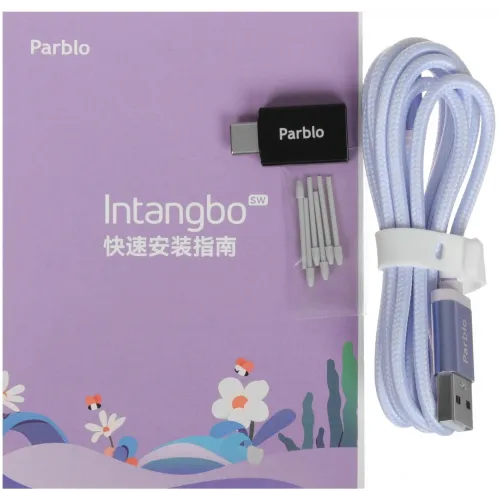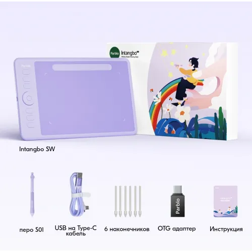 | Комплектация | графический планшет Parblo Intangbo SW, стилус без батареек, 6 сменных наконечников, адаптер OTG на Type-C, инструмент для извлечения наконечников, краткое руководство пользователя |