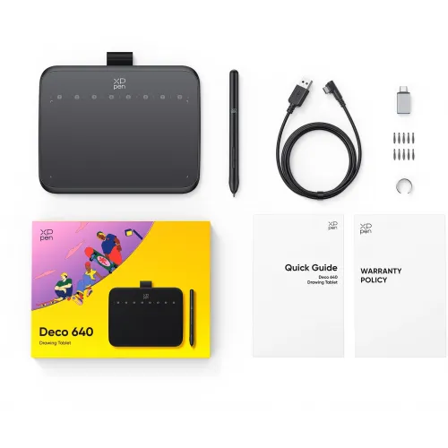 Комплектация | Графический планшет: 1 шт. Перо: 1 шт. Наконечники для пера: 10 шт. Пинцет для смены наконечников: 1 шт. Кабель USB-C-USB-A: 1 шт. Адаптер USB-USB-C: 1 шт. Краткое руководство пользователя: 1 шт. Гарантийный талон: 1 шт. |