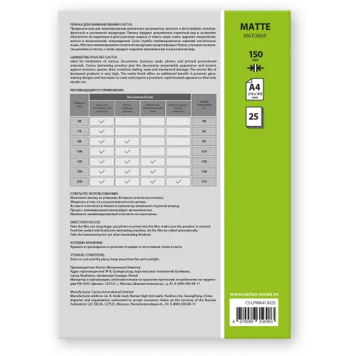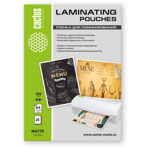 Пленка для ламинирования Cactus 150мкм A4 (25шт) матовая 216x303мм CS-LPMА415025
