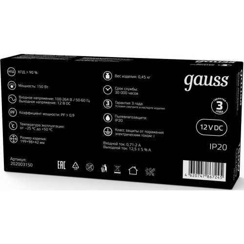 Блок питания Gauss 202003150 встраив. для лен.светод. черный
