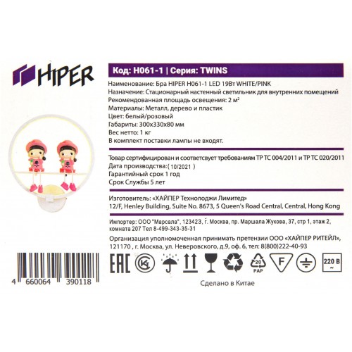 Светильник Hiper Twins H061-1 19Вт 4000K цв.св.:белый нейтральный розовый/белый