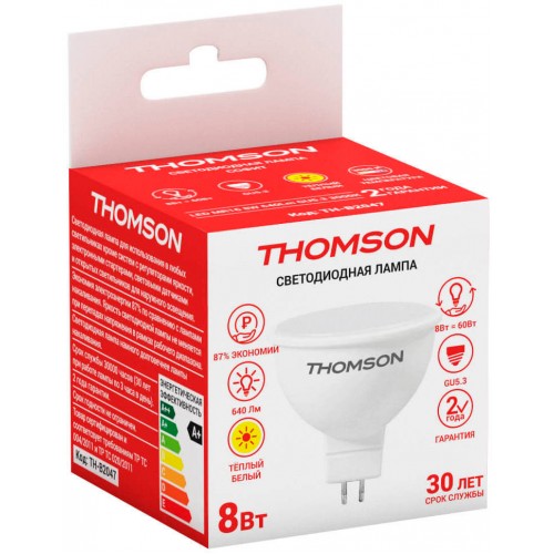 Лампа светодиодная Thomson TH-B2047 8Вт цок.:GU5.3 рефлек. 220B св.свеч.бел.теп. MR16 (упак.:1шт)