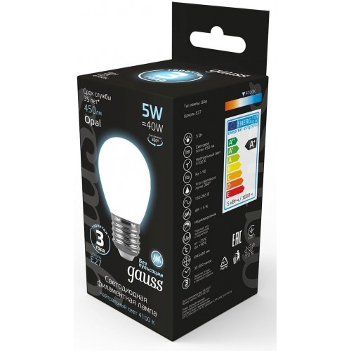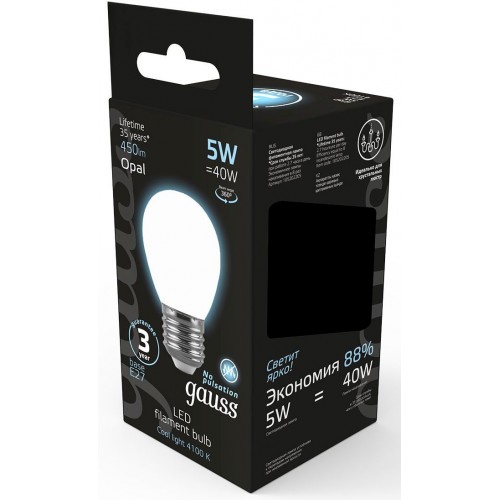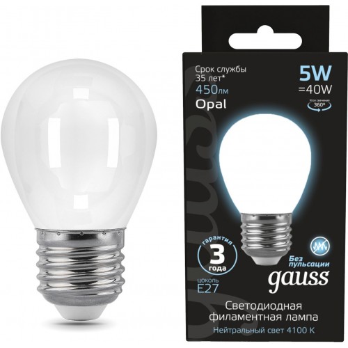 Лампа филам. Gauss Filament 5Вт цок.:E27 шар 220B св.свеч.бел.нейт. (упак.:1шт) (105202205)
