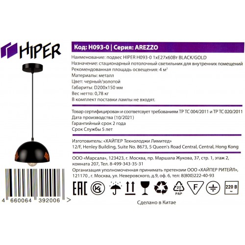 Светильник Hiper Arezzo H093-0 подвес. черный/золотистый