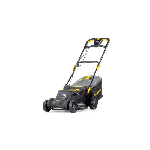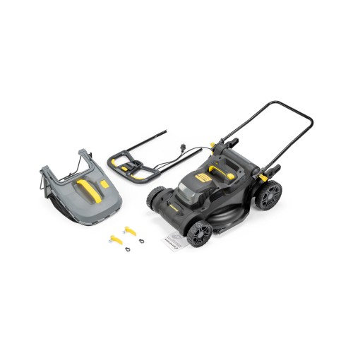 Модель оборудована травосборником объёмом 40 литров, который удобно опустошать. При весе всего 17 кг, газонокосилка остаётся устойчивой и легко управляемой. Большие задние колёса улучшают проходимость, а эргономичная ручка обеспечивает комфорт при длительной работе.