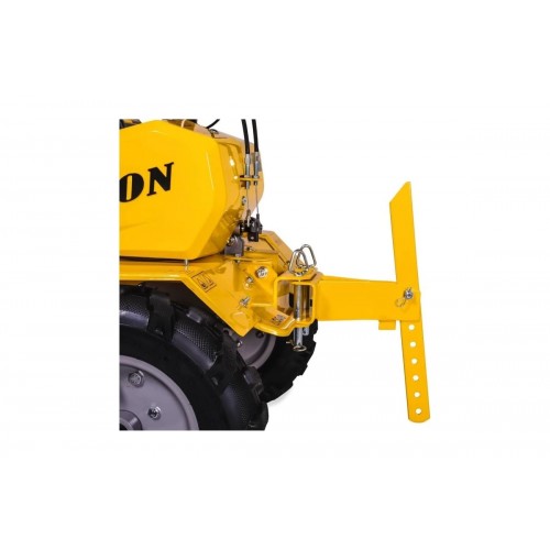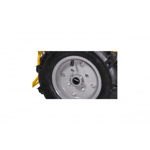 Мотоблок оснащен пневматическими колесами, что упрощает перемещение агрегата по рабочей территории, и двигателем мощностью 7 л.с. Топливный бак имеет широкую горловину для удобства заливки бензина.