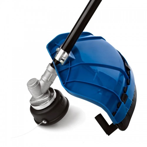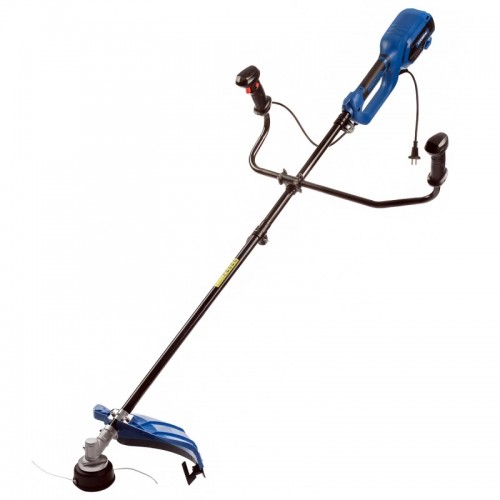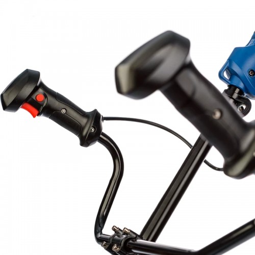 Элементы управления вынесены на правую рукоятку как у бензиновых моделей. Кнопка блокировки предохраняет от случайного включения. Двигатель плавно набирает обороты. Скорость вращения оснастки регулируется силой нажатия на пусковой курок.