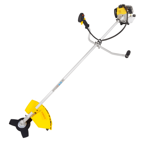 Модель оснащена сменными рабочими элементами для разных видов зелени. Леска диаметром 2 мм качественно удаляет травянистый покров, ширина захвата достигает 46 см. Для борьбы с крупными сорняками предназначен трехлопастной нож 3Т. Все органы управления сосредоточены на удобной ручке. Триммер оснащен системой электронного зажигания, позволяющей запустить инструмент простым нажатием клавиши. Устройство подходит для кошения влажной травы сразу после осадков. Звук работающего мотора не превышает допустимый уровень громкости — 96 децибел.