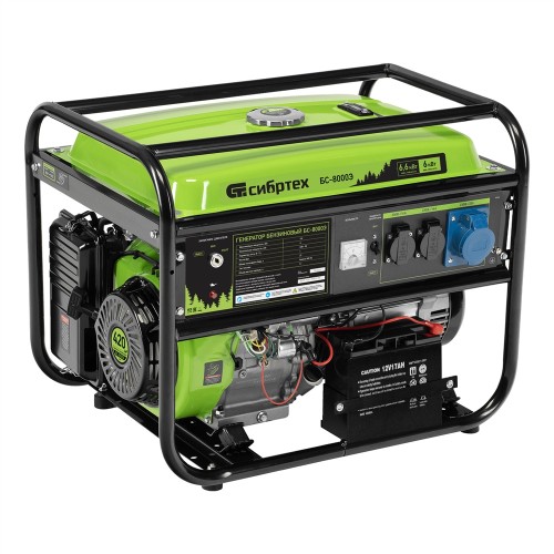 Бензиновый генератор Сибртех БС-8000Э 94549 мощностью 6,6 кВт, с 4-тактным двигателем, электростартером и баком объемом 25 л, выдает напряжение 230 В и является самым производительным в линейке. Подойдет для дачи, строительной площадки, мастерской, гаража или магазина. Благодаря мощности 6,6 кВт и наличию силовой розетки способен обеспечить бесперебойную работу нескольких потребителей одновременно, например, электрической плиты, холодильника, 5 ламп накаливания. Электростартер облегчает запуск — для начала работы достаточно просто повернуть ключ.