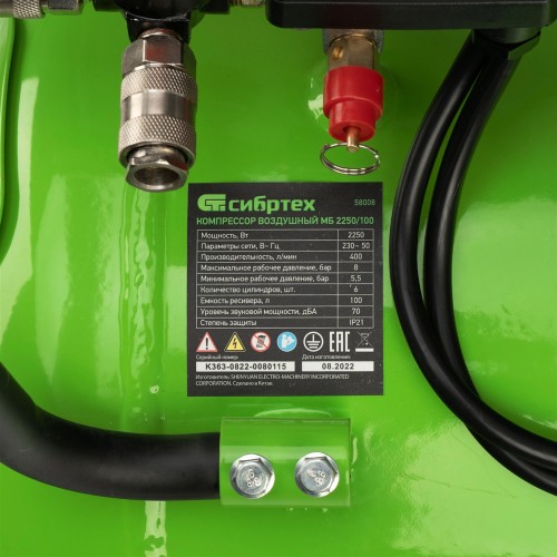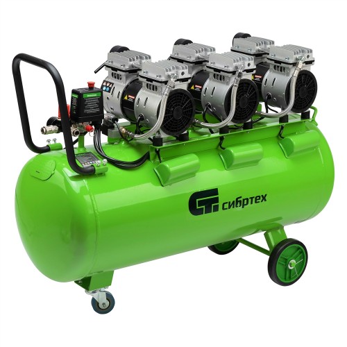 Безмасляный малошумный компрессор Сибртех МБ 2250/100 58008 мощностью 2250 Вт и объемом ресивера 100 л имеет производительность на входе 400 л/мин и сжимает воздух под давлением до 8 бар. Используется для обеспечения функционирования пневмоинструмента, например, краскораспылителя, перфоратора или пневматического шуруповерта. Для работы устройства не требуется масло, поэтому воздух на выходе не содержит его частиц. Компрессор оптимален для проведения покрасочных работ и продувки электронных компонентов.;Одна из ключевых особенностей компрессора — низкий уровень шума (не превышает 70 дБ), позволяющий использовать устройство в жилом помещении без дискомфорта для людей.