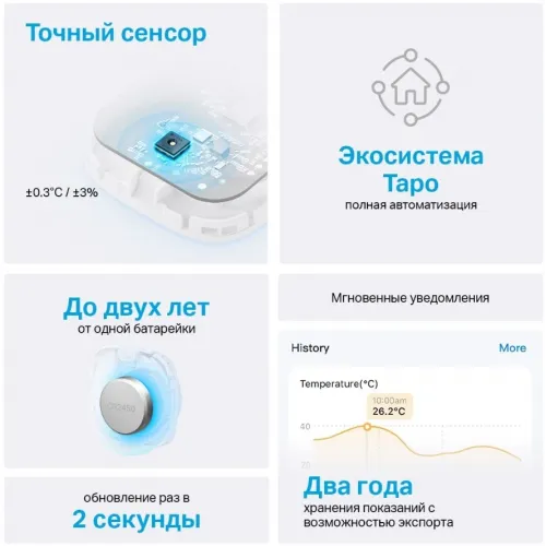 | Описание | Высокая точность — используемый в датчике швейцарский сенсор позволяет измерять температуру и влажность воздуха с точностью до ±0,3 ?C и до ±3%, соответственно, при этом показания обновляются раз в две секунды. Автоматизация дома — автоматически включает или выключает домашнюю электронику |