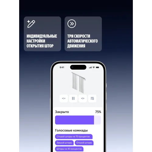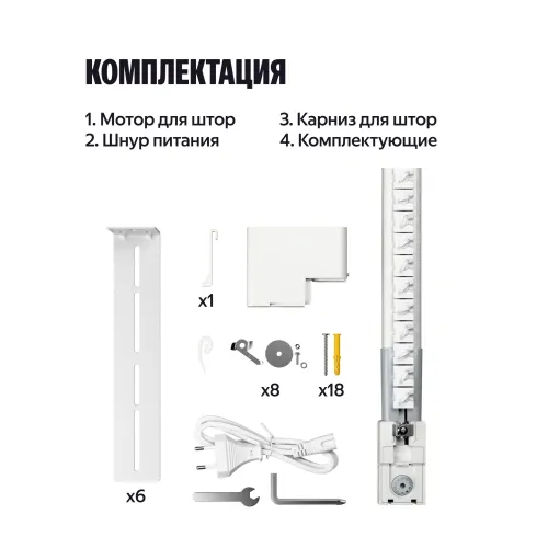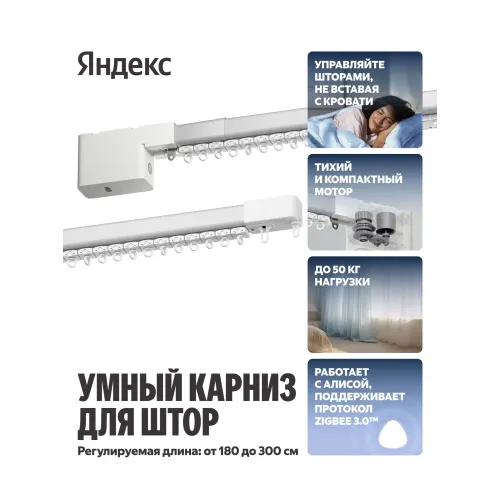 | Описание | Умный карниз работает от электросети — просто включите его в ближайшую розетку с помощью кабеля. А потом подключите к умному дому через приложение Дом с Алисой и Яндекс Станцию или хаб, поддерживающие протокол Zigbee. |