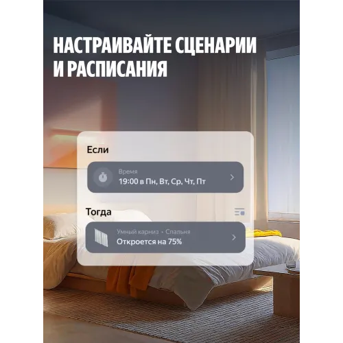 | Описание | Умный карниз работает от электросети — просто включите его в ближайшую розетку с помощью кабеля. А потом подключите к умному дому через приложение Дом с Алисой и Яндекс Станцию или хаб, поддерживающие протокол Zigbee. |
