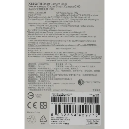 | Комплектация | Умная камера Xiaomi Smart Camera C100; кабель для зарядки; комплект для настенного монтажа; монтажная наклейка; руководство пользователя |